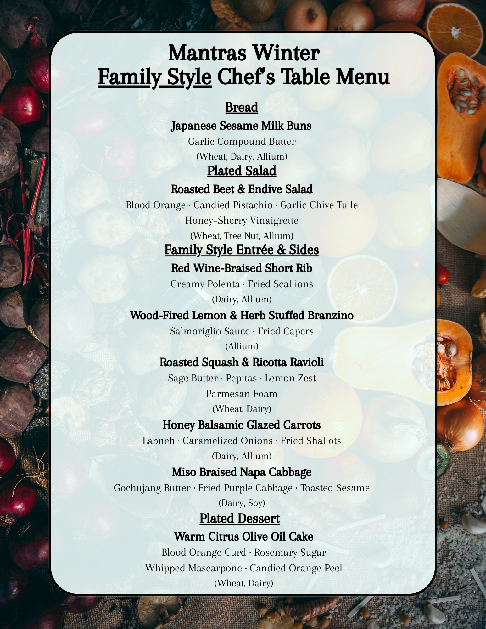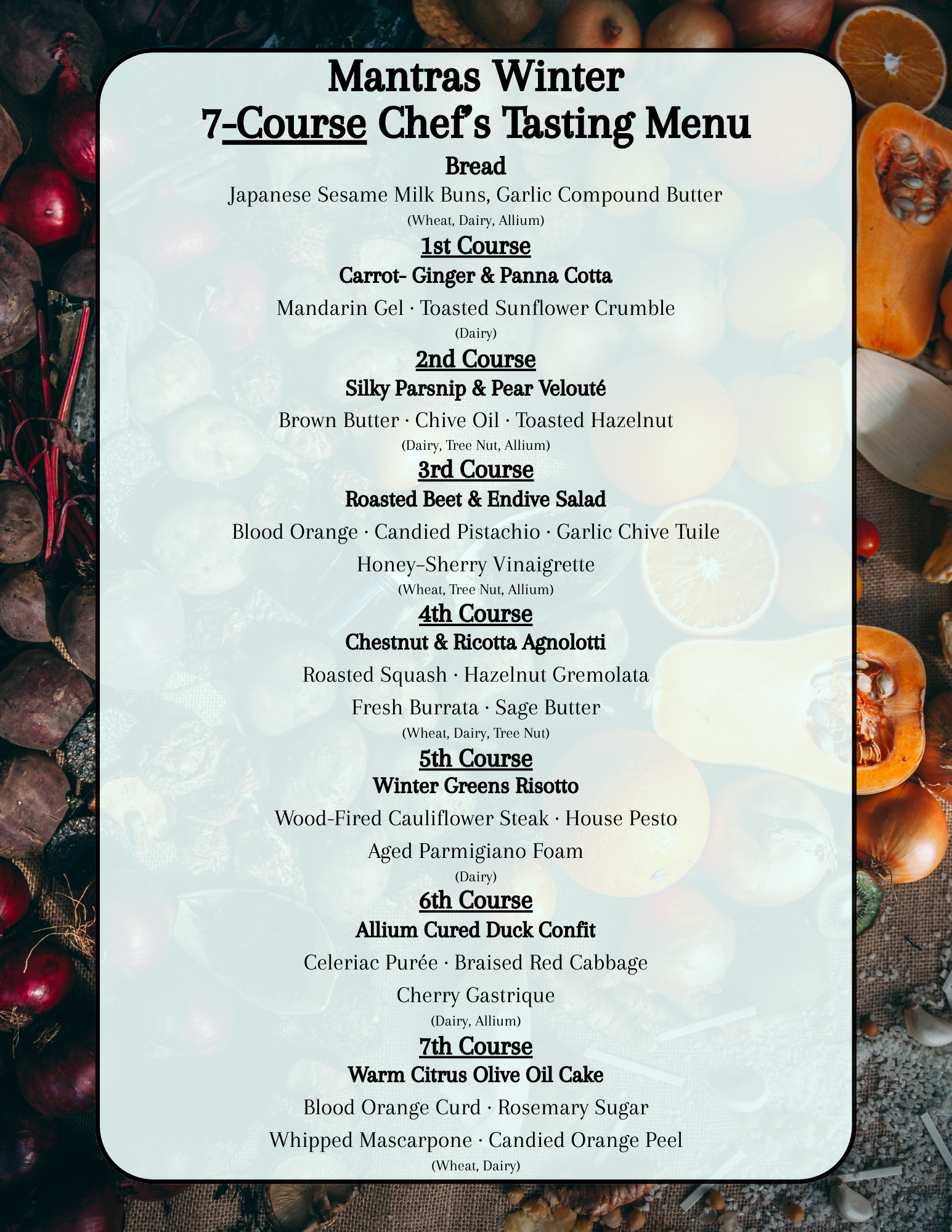 You don't need a group of 6 to have a seat at the table. Our new Mantras Supper Club: The Winter Series allows you to purchase individual tickets for a shared 5-course journey. Experience the same culinary mastery alongside a new community of food lovers.